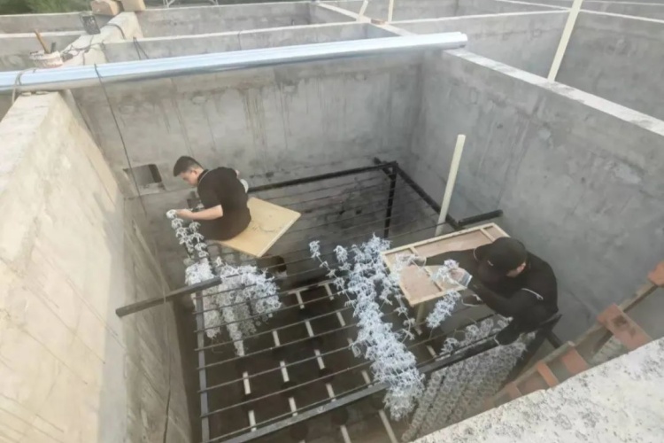 早上六點半準(zhǔn)時到達(dá)現(xiàn)場后,工程部詳細(xì)講解填料綁扎技巧,便緊鑼密鼓地開展工作。池底可移動空間非常有限,悶熱的空氣里混雜著泥土與汗水的味道。但公司所有員工都在盡自己的全力,從高處到池底,謹(jǐn)慎卻又堅定地在鋼架間移動,只為按期順利交付。