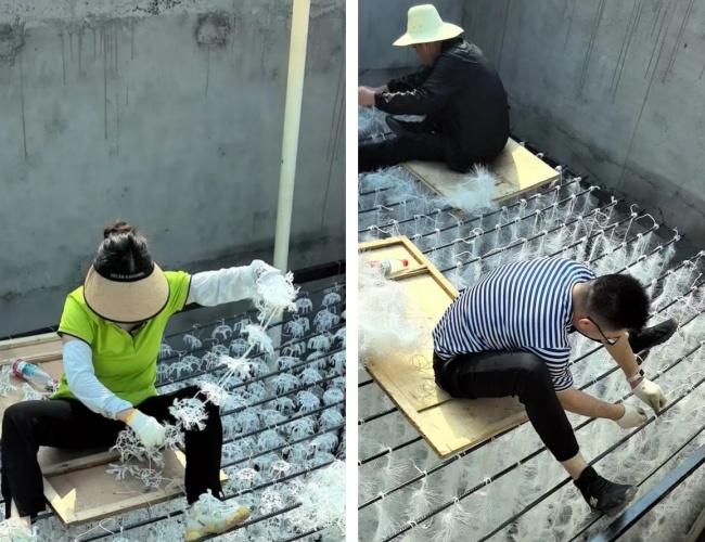 在鋼架焊接工作收尾后,緊接著的填料綁扎成了搶工期的關(guān)鍵。這些密密麻麻的填料是污水處理的“主力軍”,需要手工逐一固定在鋼架上,工作量大且要求細(xì)致。公司當(dāng)即決定:全公司總動員,所有人前往施工現(xiàn)場,進入池內(nèi)協(xié)助綁填料。